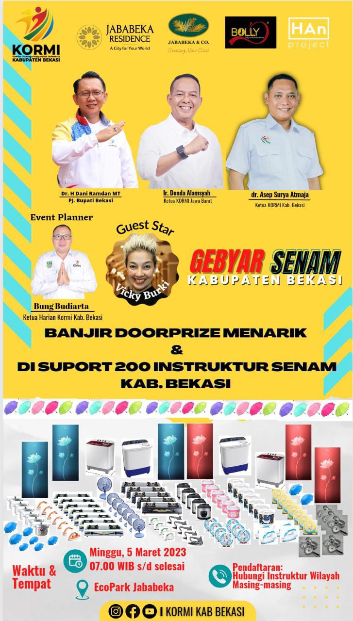 “Gebyar senam akbar nanti akan melibatkan sepuluh ribu peserta dengan penampilan empat jenis senam diantaranya senam jantung sehat, senam dansa,senam aerobik, dan senam zumba,”ucap Ketua Harian KORMI Kabupaten Bekasi, Budiarta Rabu (22/02/ 2023).
